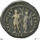 • Design Emperor (Caracalla) in military attire standing facing, head left, wearing cuirass and boots, holding thunderbolt in outstretched right hand, left resting on long sceptre; behind him, Nike standing left, crowning emperor with laurel wreath in right hand, holding palm branch in left arm. Ground line. Border of dots.