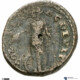 • Design Nemesis standing facing, head left, wearing long garment, holding cubit-role in right hand and reins in left hand; at her feet, left, wheel. Ground line. Border of dots.