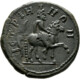 • Design Bearded god with kalathos (or Theos Megas, Mitras, Serapis) on horse pacing right; behind, bird perched on cuspidal stick.