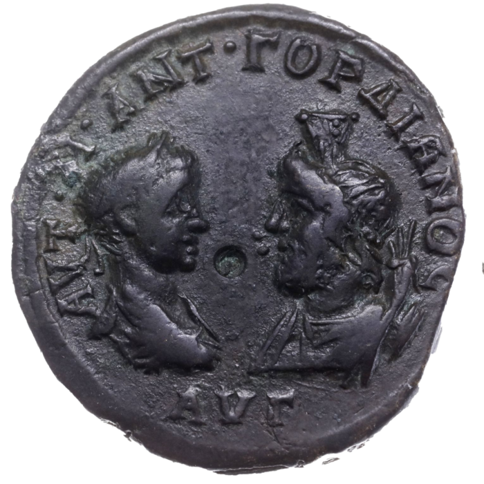 • Design Busts of Gordian and Sarapis facing each other, next to a cornucopia