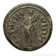 • Design Tyche standing facing, head left, wearing kalathos, holding rudder in right hand and cornucopia in left arm. Short ground line. Border of dots.
