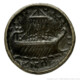 • Design Galley, under full sail, sailing right, eight rowers on board and helmsman seated on stern in front of two standards.