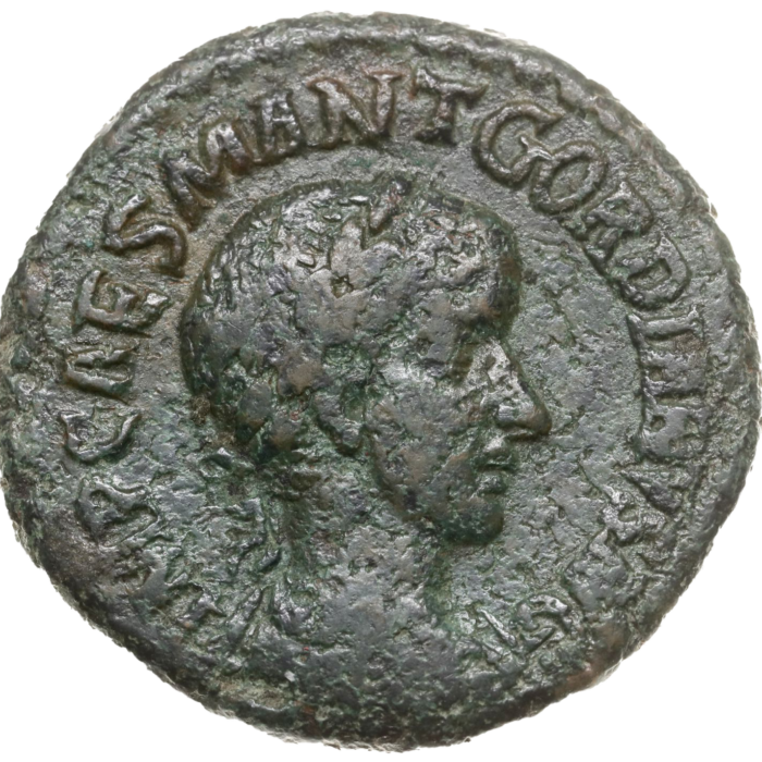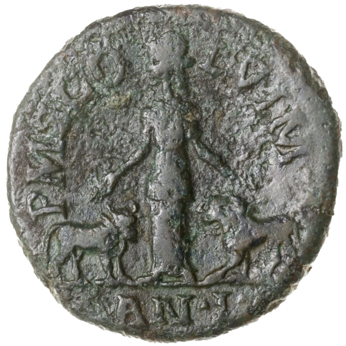 • Design Moesia standing slightly to the left, holding her hands over the lion and bull standing at her sides