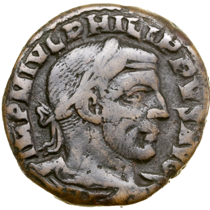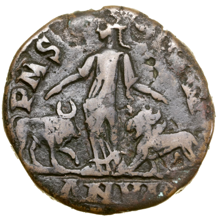 • Design Moesia standing slightly to the left, holding her hands over the lion and bull standing at her sides