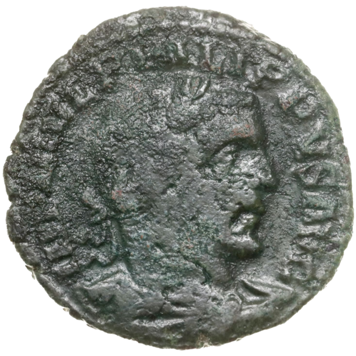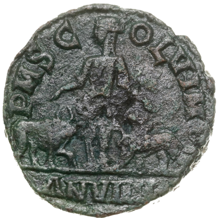 • Design Moesia standing slightly to the left, holding her hands over the lion and bull standing at her sides
